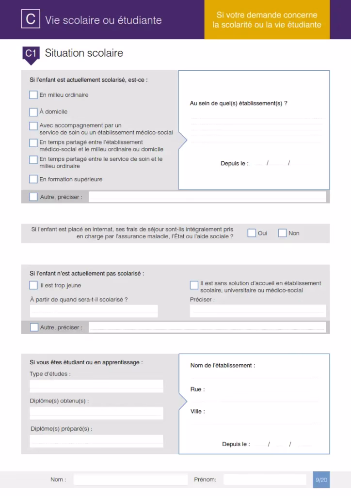 ეს ნიშნავს, რომ თუ თქვენ ან თქვენი შვილი, ან თქვენს მეურვეობაში მყოფი არასრულწლოვანი პირი, ვისთვისაც ავსებთ ფორმას, ან თავად MDPH მომთხოვნი პირი არის მოსწავლე ან სტუდენტი და სჭირდება/გჭირდებათ დახმარება სკოლაში ან უნივერსიტეტში, მაშინ უნდა გადახვიდეთ ამ ნაწილის შევსებაზე.