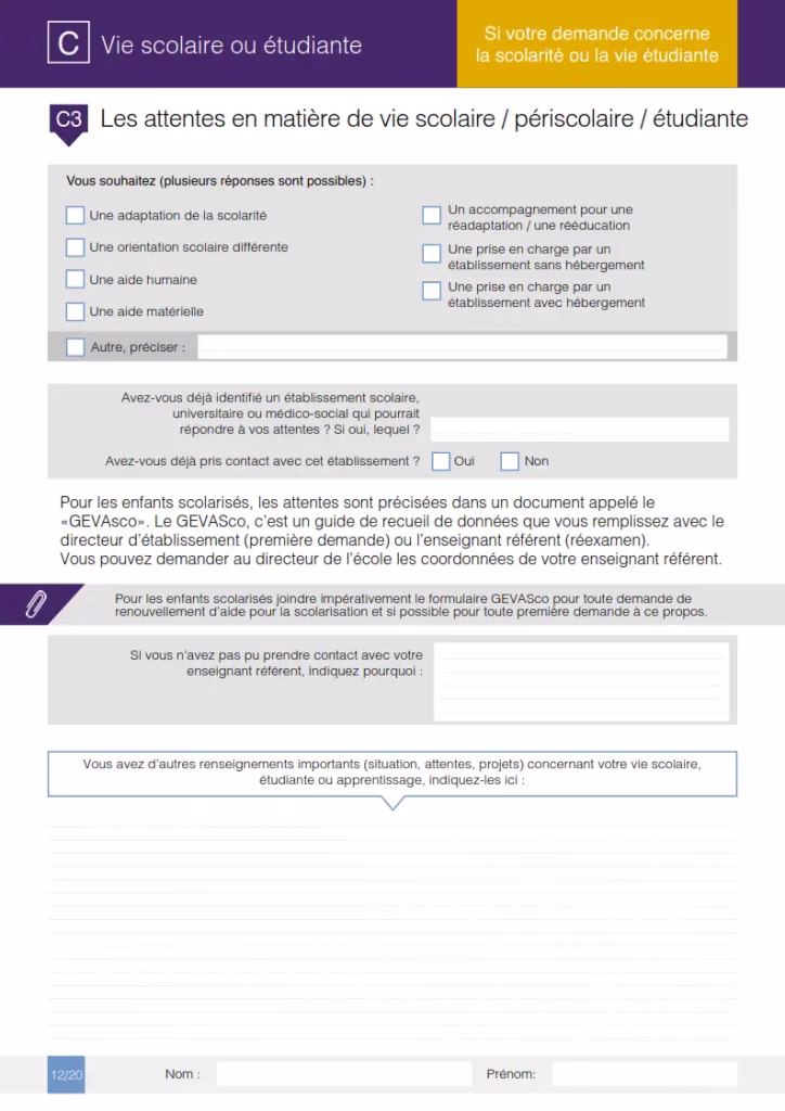 Pour les enfants scolarisés, les attentes sont précisées dans un document appelé le «GEVAsco». Le GEVASco, c’est un guide de recueil de données que vous remplissez avec le directeur d’établissement (première demande) ou l’enseignant référent (réexamen). Vous pouvez demander au directeur de l’école les coordonnées de votre enseignant référent.