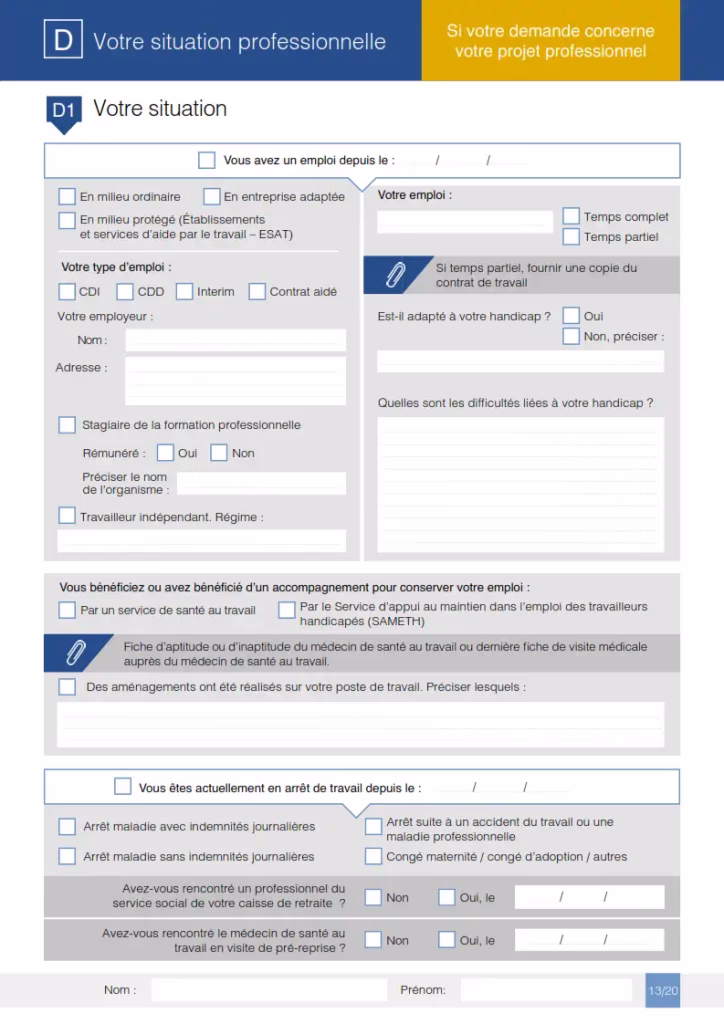 შემდეგი გრაფა Vous êtes actuellement en arrêt de travail depuis le : უნდა შეავსოთ მხოლოდ იმ შემთხვევაში, თუ თქვენ ამჟამად მუშაობთ, მაგრამ დროებით არ იმყოფებით სამსახურში რომელიმე ქვემოთ ჩამოთვლილი მიზეზის გამო, მაგალითად, ბიულეტენზე ყოფნის გამო. თუ თქვენ უმუშევარი ხართ ან პენსიაზე, ეს ნაწილი თქვენ არ გეხებათ და შეგიძლიათ გამოტოვოთ.