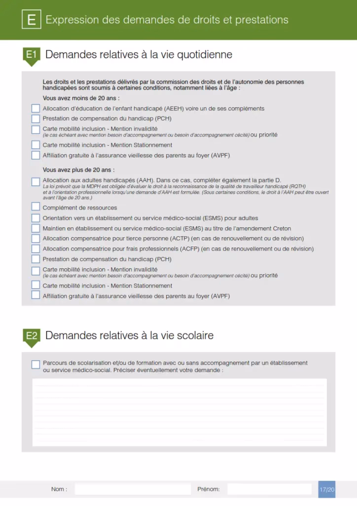 - Allocation aux adultes handicapés (AAH): შეზღუდული შესაძლებლობის მქონე ზრდასრულთა შემწეობა (AAH). თუ მოითხოვთ ამ შემწეობას, აუცილებელია, რომ ასევე შეავსოთ ნაწილი D.