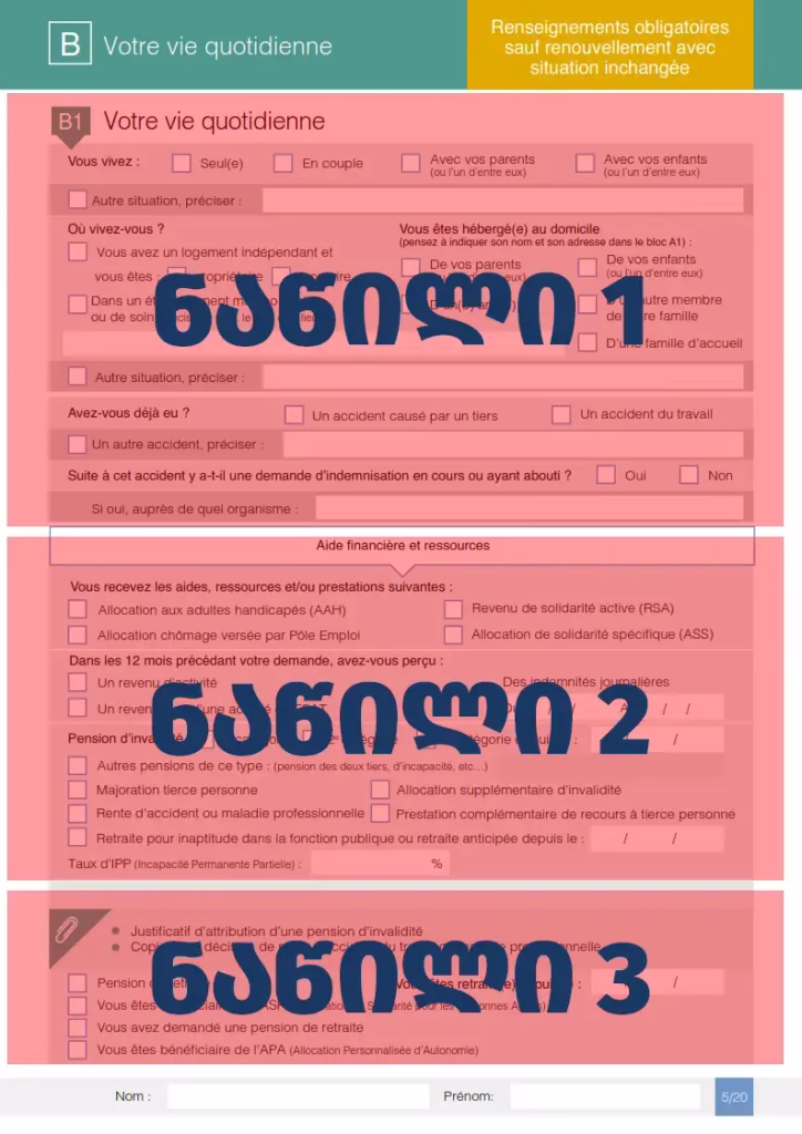 - Pension d’invalidité: (ინვალიდობის პენსია) მონიშნეთ თუ გაქვთ რომელიმე ჩამოთვლილთაგანი. თუ არა – გამოტოვეთ ველი
