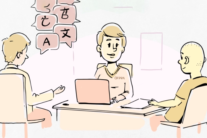 ინტერვიუ მიმდინარეობს OFPRA-ს დაცვის ოფიცერთან, რომელიც პასუხისმგებელია თქვენი თავშესაფრის მოთხოვნის ისტორიის შეგროვებაზე. მან იცის თქვენი რეგიონის მდგომარეობა, წაიკითხა თქვენი ისტორია და გააკეთა მისი ფაქტების შემოწმება. დაზუსტებული ინფორმაციით ხანდახან Google Street View-ითაც კი ამოწმებს, როგორ გამოიყურება თქვენი სახლი მითითებულ მისამართზე და რა ფერისაა მისი კარი. ის მონაწილეობას მიიღებს თქვენს მოთხოვნაზე დადებითი ან უარყოფითი გადაწყვეტილების მიღებაში.